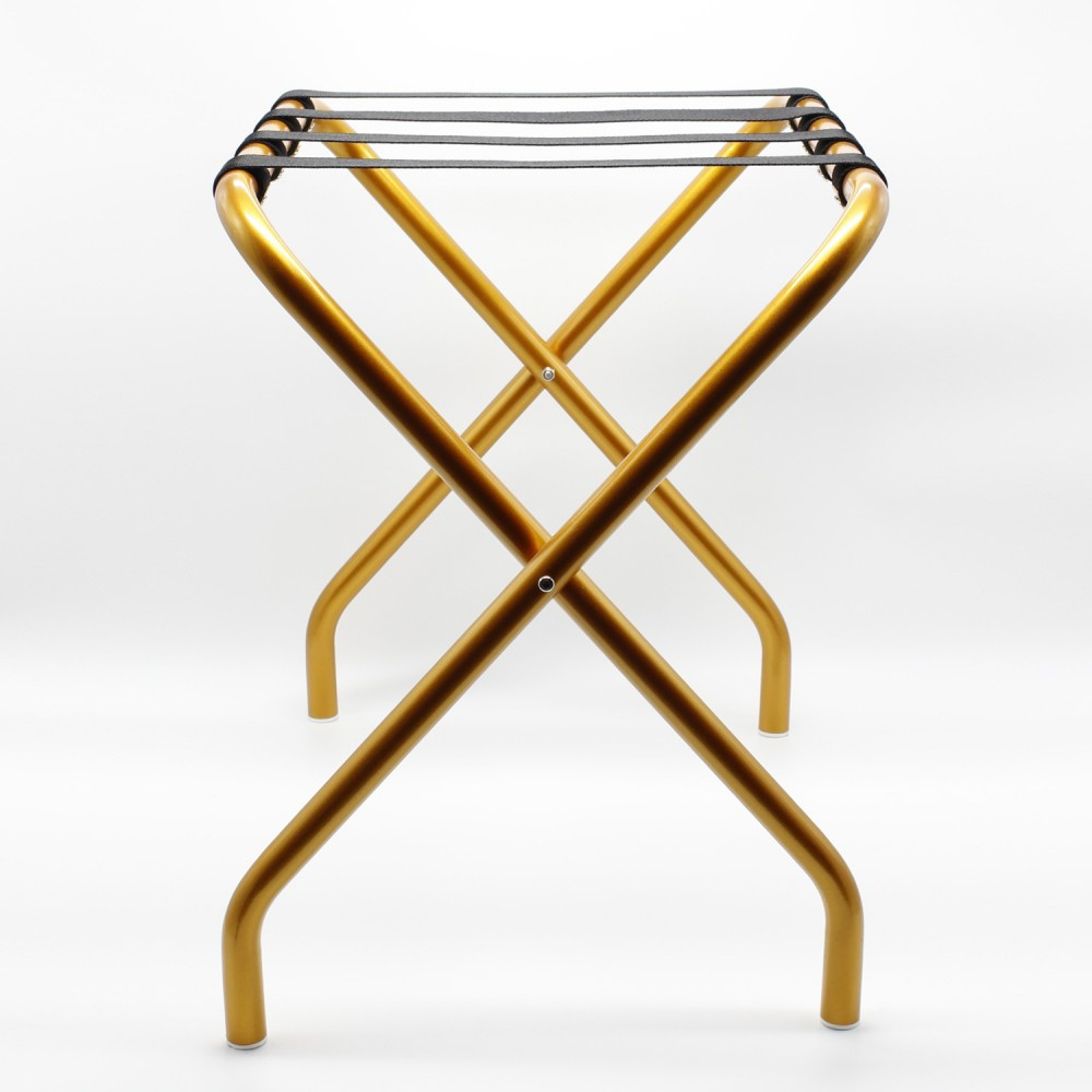 Kofferständer ohne Rückenlehne mit pulverbeschichtetem goldfarbenem Finish, schwarzen Riemen. Gummi-Pad-Bodenenden. Maße: Breite: 60 cm, Tiefe: 41 cm, Höhe: 54 cm.