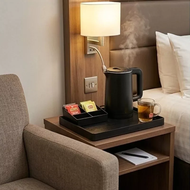 Szállodai welcome tálca szett, vízforralóval, tálcával és duplás tároló rekesszel. Vízforraló kapacitása 1L, 2 rétegű cool touch. 1200W-1400W, 304 rozsdamentes acél belső. Gyors vízforralás, automatikusan kikapcsol, száraz forralás elleni védelem, 360 fokban forgatható és szabadon levehető a vízforraló, fény indikátor lámpa. Kicsi doboz méretei: 15,5x11,5x5cm. A nagy tálca mérete: 38,5x30,8x2,25cm.