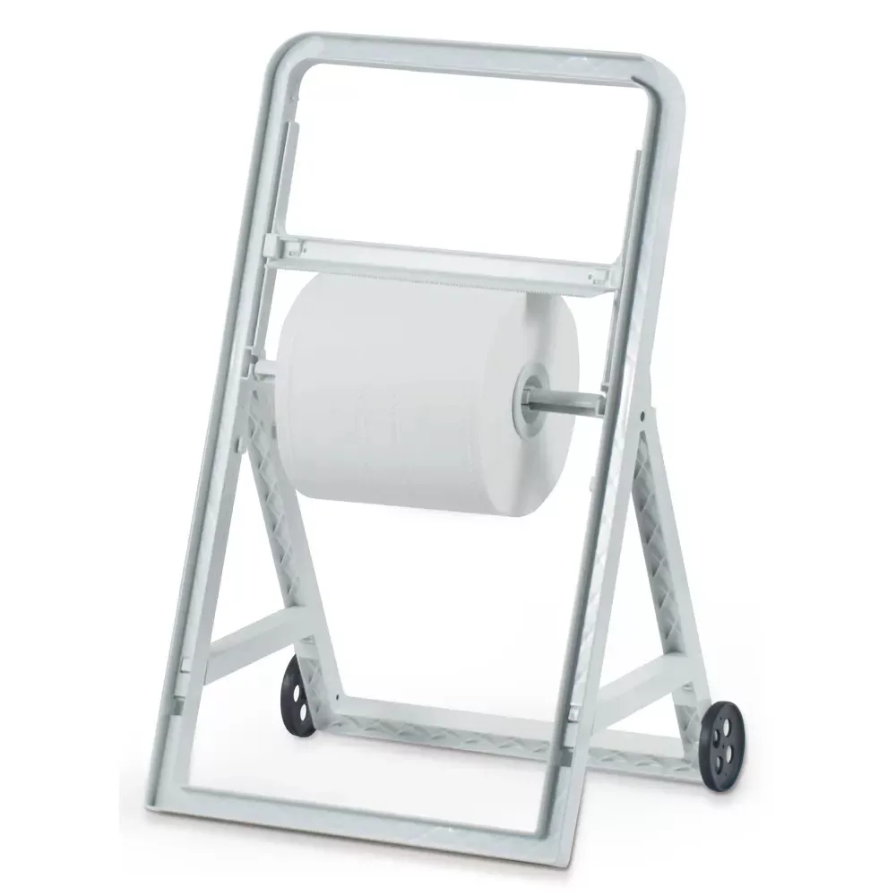 Clear+ ipari papírtekercs tartó álló, fehér színű. Mobil verzió kerekekkel, különböző területekre. Nagy töltőkapacitás, alkalmas átlagos és nagy forgalmú területekre. Töltésre és tisztításra például ipari területeken és műhelyekben. 1db/csomag.