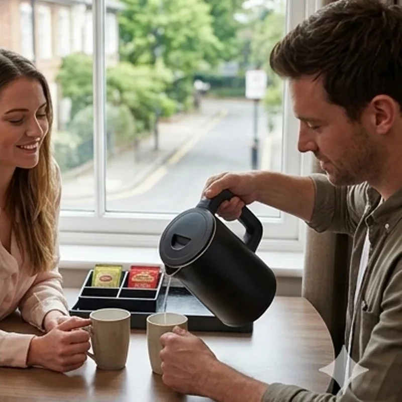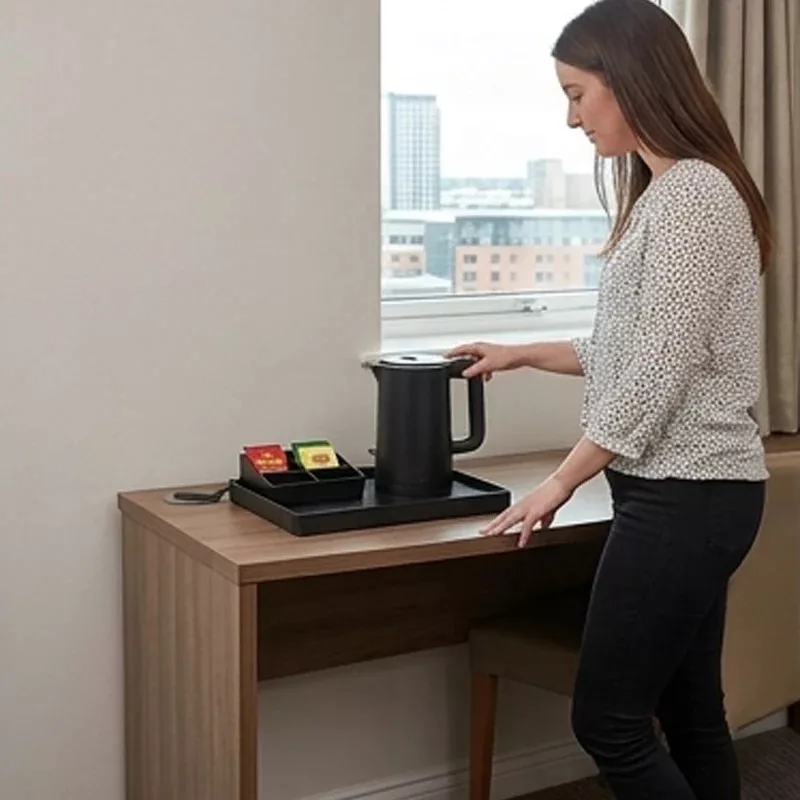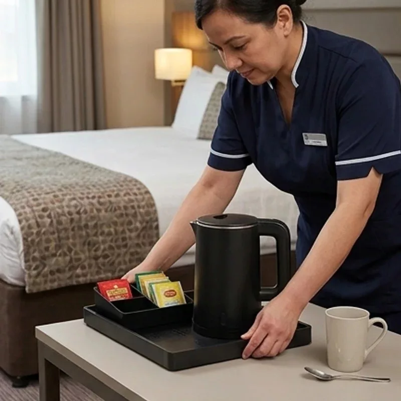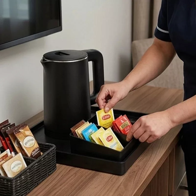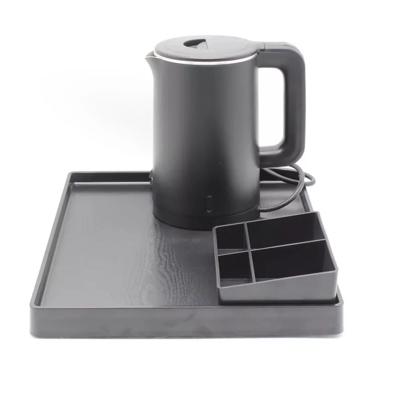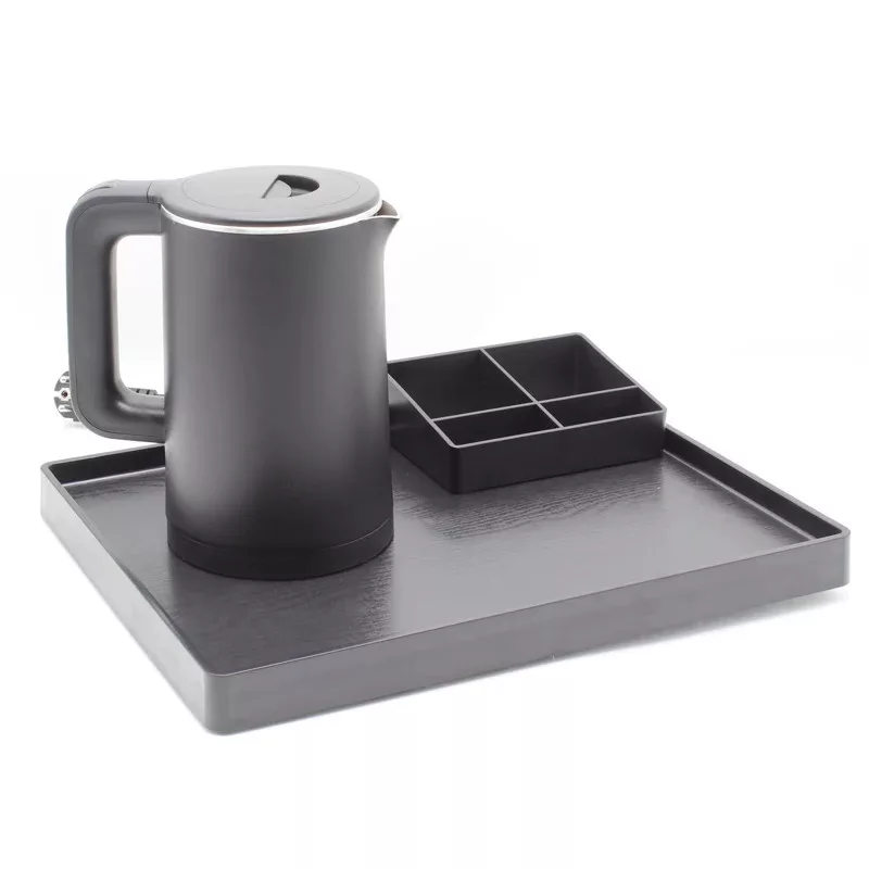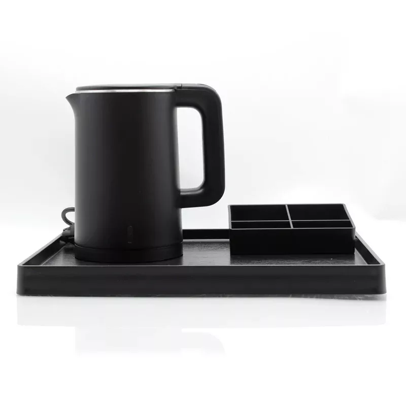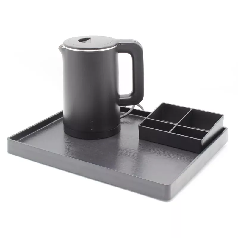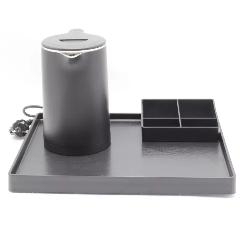 Szállodai welcome tálca szett, vízforralóval, tálcával és duplás tároló rekesszel. Vízforraló kapacitása 1L, 2 rétegű cool touch. 1200W-1400W, 304 rozsdamentes acél belső. Gyors vízforralás, automatikusan kikapcsol, száraz forralás elleni védelem, 360 fokban forgatható és szabadon levehető a vízforraló, fény indikátor lámpa. Kicsi doboz méretei: 15,5x11,5x5cm. A nagy tálca mérete: 38,5x30,8x2,25cm.